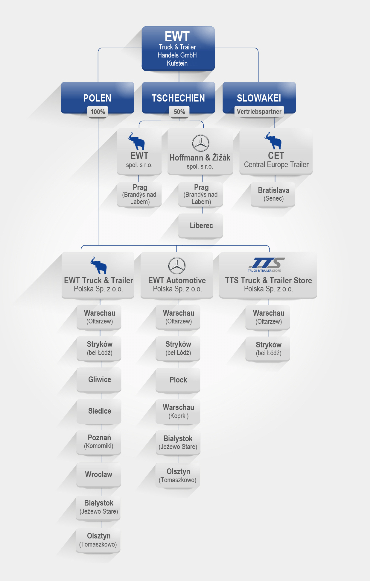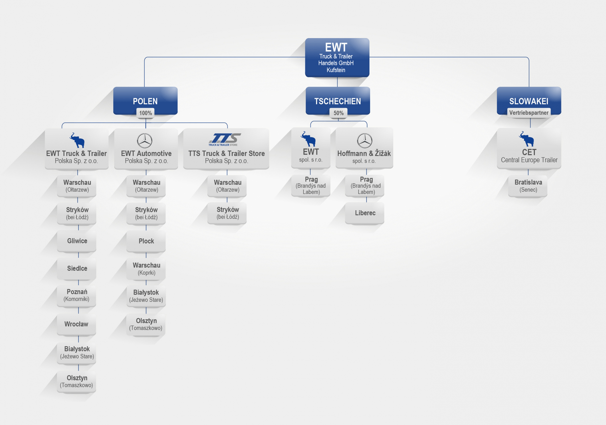 Firmenzentrale der EWT-Gruppe ist die EWT Truck & Trailer Handels GmbH mit Sitz in Kufstein / Österreich, deren Unternehmensgegenstand die Generalvertretung der Schmitz Cargobull AG in Polen, Tschechien und der Slowakei darstellt. Hier werden die Anteile an den Schmitz Cargobull und Mercedes-Benz Vertretungen in Polen und Tschechien gehalten. Neben der strategischen Steuerung der Tochtergesellschaften findet in Kufstein die zentrale Auftragsabwicklung für den gesamten Trailerbereich statt.