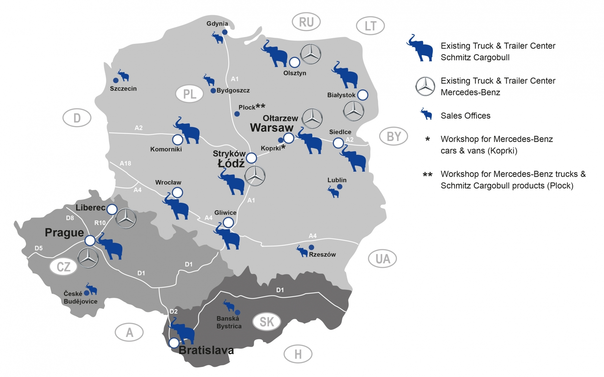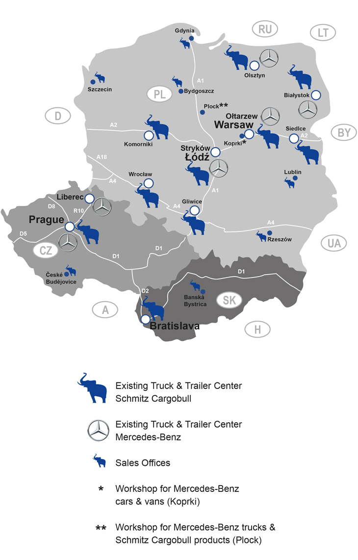 The EWT group has been among the leading premium-partners in the truck & trailer sector since 1995. As the general representative of Schmitz Cargobull AG for the markets Poland, Czech Republic and Slovakia as well as the authorised dealer for Mercedes-Benz in Poland and the Czech Republic, EWT provides individual transport solutions and customised full-service-concepts for the most discerning requirements.