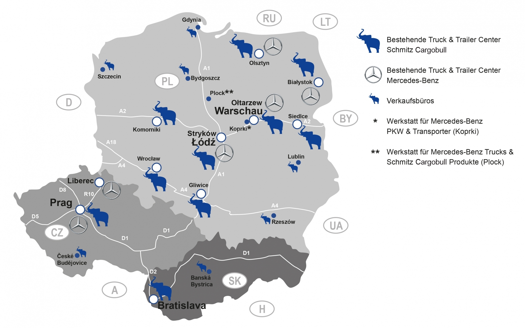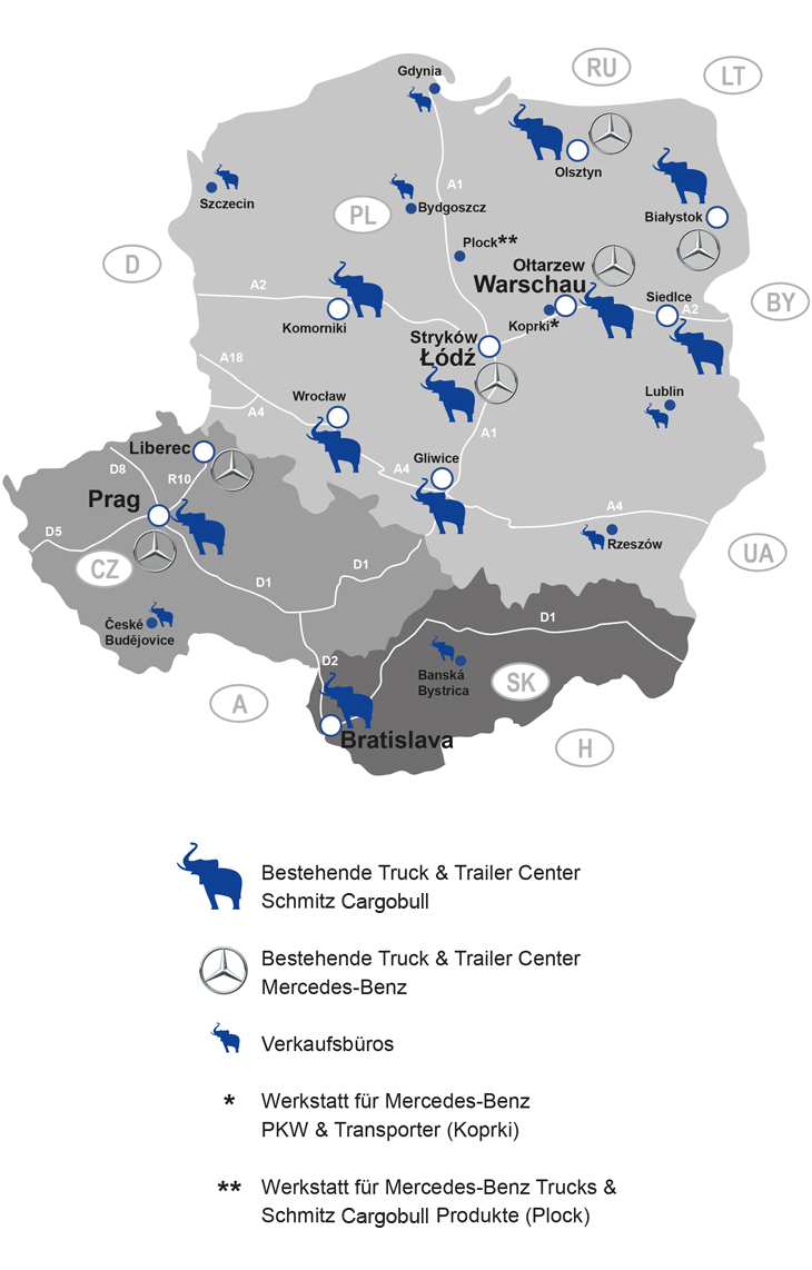 Mit innovativen Kompetenzzentren und Vertriebsbüros in Polen, Tschechien und der Slowakei stellen wir sicher, dass unsere Kunden von den maßgeschneiderten Produktlösungen und dem Komplettangebot an Servicedienstleistungen optimal profitieren. Die Standorte befindet sich in unmittelbarer Nähe von wichtigen Verkehrsknotenpunkten und verfügen neben eigenen Full-Service-Werkstätten auch über ein umfassendes Ersatzteil-Lager mit Originalteilen der Hersteller.